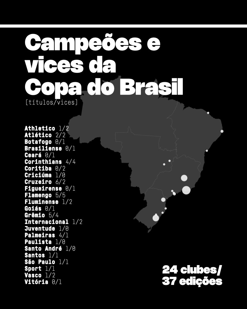 Na segunda competição mais valiosa do País, os clubes do Sudeste dominam com 21 vice-campeonatos entre 1989 e 2025 (56%). Esse domínio é ligeiramente inferior ao observado anteriormente no Brasileirão por pontos corridos (59,1%), mas, outro aspecto que também precisa ser observado é a menor concentração de clubes que chegaram à final: foram 20 agremiações diferentes que alcançaram a decisão da Copa do Brasil mas que saíram derrotadas, contra 10 que terminaram na segunda colocação dos pontos corridos entre 2003 e 2025.