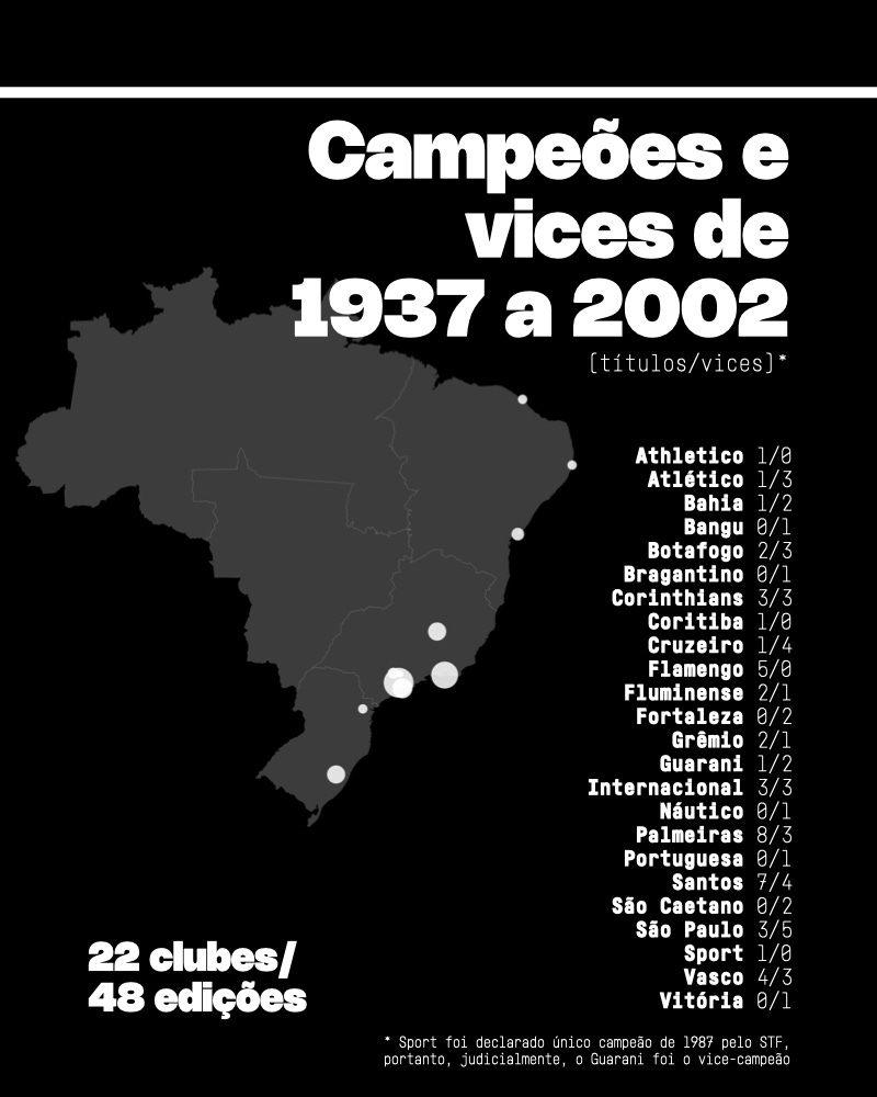 1) Mesmo excluindo o Guarani pelos mesmos motivos apontados acima que justificam a conquista do título nacional do clube campineiro, em 1978 — o Bugre terminou em segundo lugar duas vezes (1986 e 1987) —, é importante perceber que também houve a presença de quatro clubes considerados “não-grandes” do Sudeste entre os vice-campeões brasileiros em cinco oportunidades, quando a fórmula de disputa era o mata-mata. Chegaram à final: São Caetano, duas vezes (2000 e 2001); Portuguesa (1996), Bragantino, muito tempo antes da Red Bull comprar o clube (1991); e Bangu (1985).