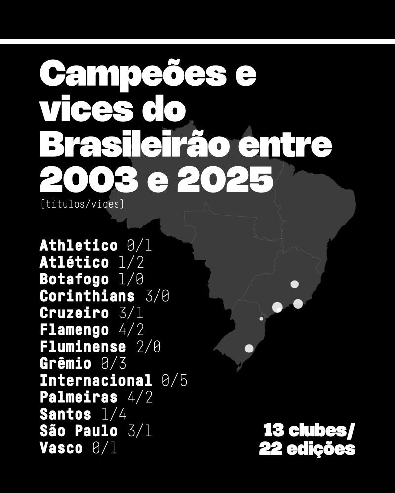 Essa leitura envolvendo os vice-campeões amplia o entendimento sobre os resultados finais das principais competições nacionais ao longo da História. As conclusões são quase que óbvias: os principais clubes do Sudeste dominam avassaladoramente o topo do futebol brasileiro não importa qual seja o sistema de disputa ao mesmo tempo que no sistema de mata-mata o espectro é significativamente ampliado quantitativa e relativamente quanto às regiões dos clubes. Entretanto, ao longo de 38 rodadas o Brasileirão se provou uma competição restrita às ambições das 12 maiores torcidas do País.